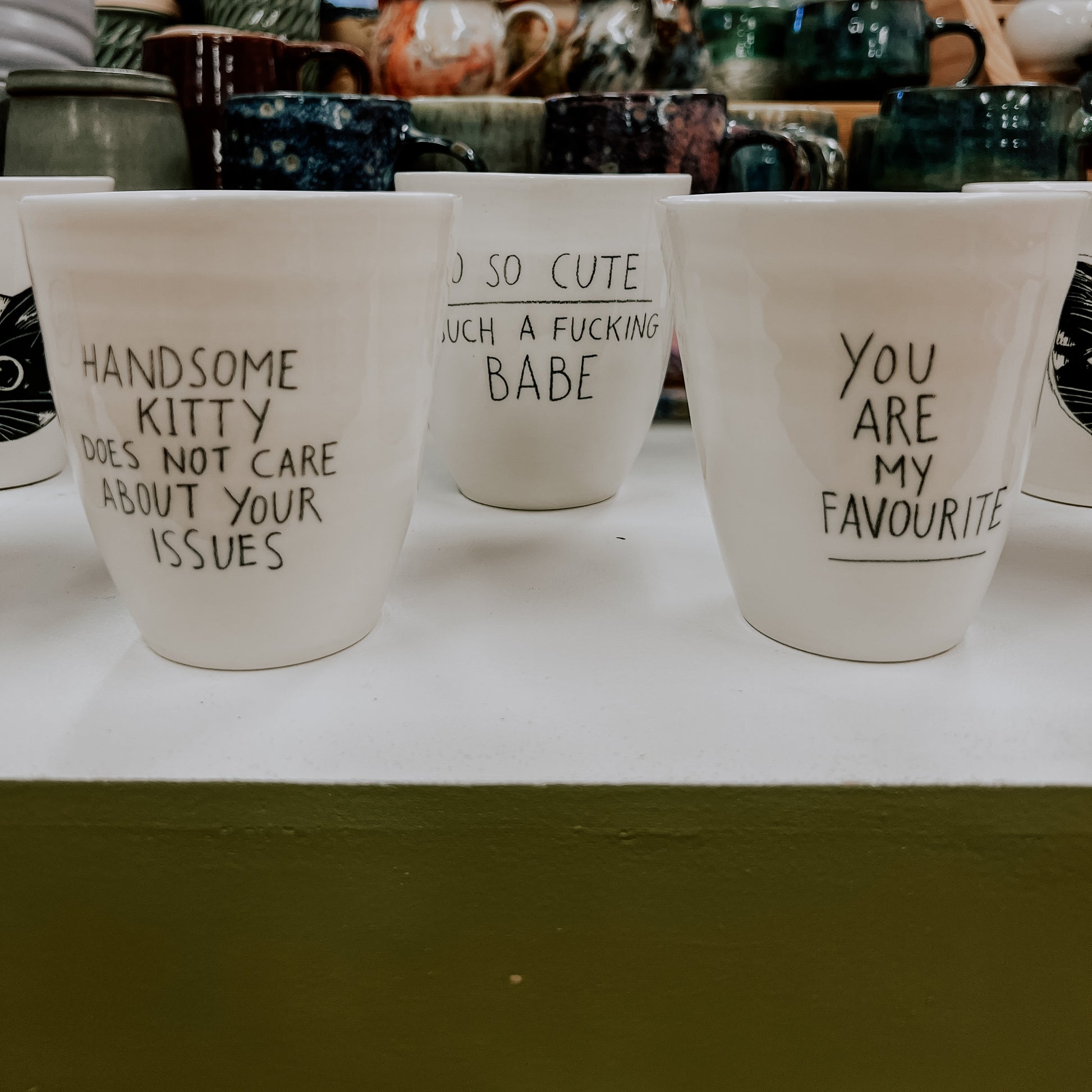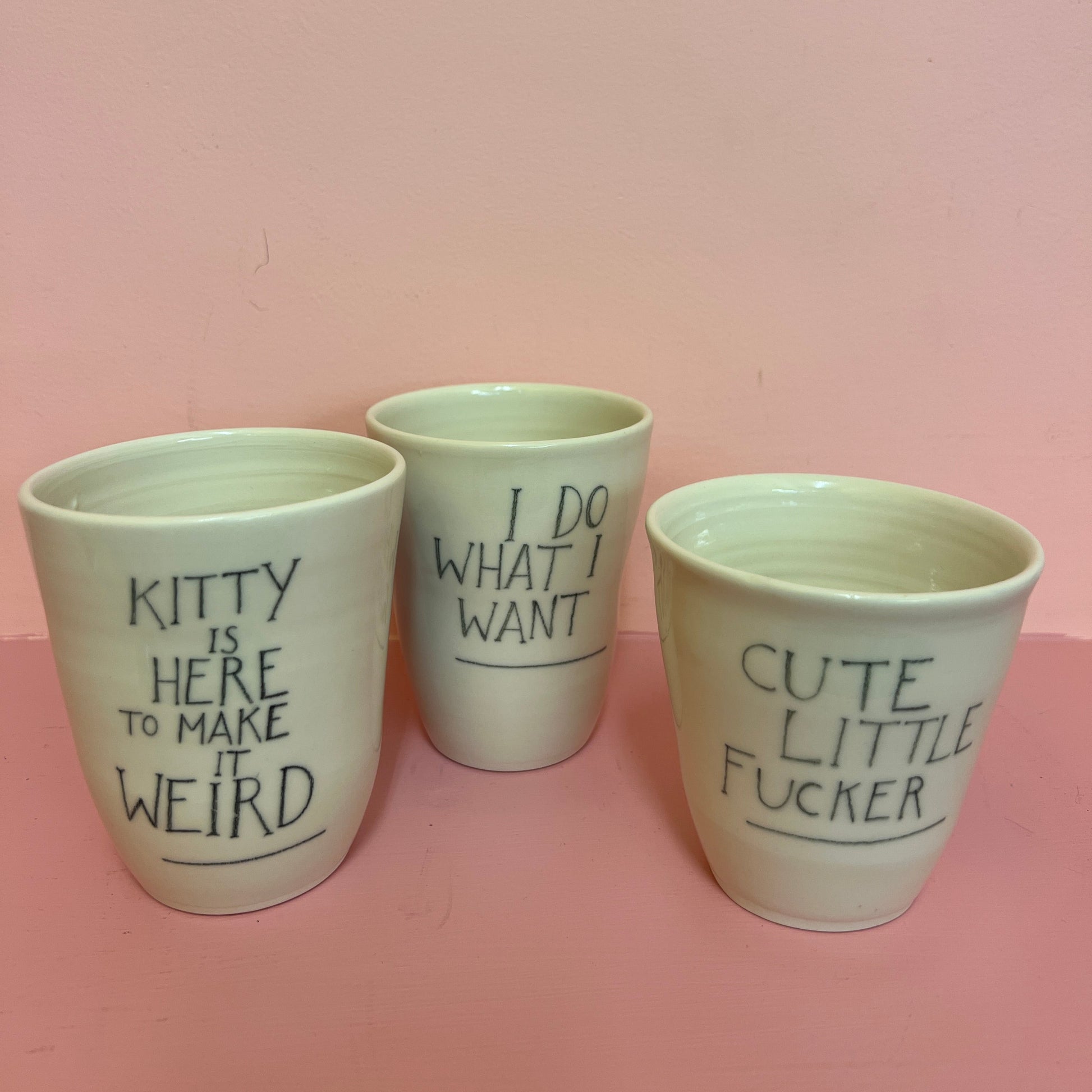 Kitty Tumblers are approximately 10cm high with a 9cm diameter rim.