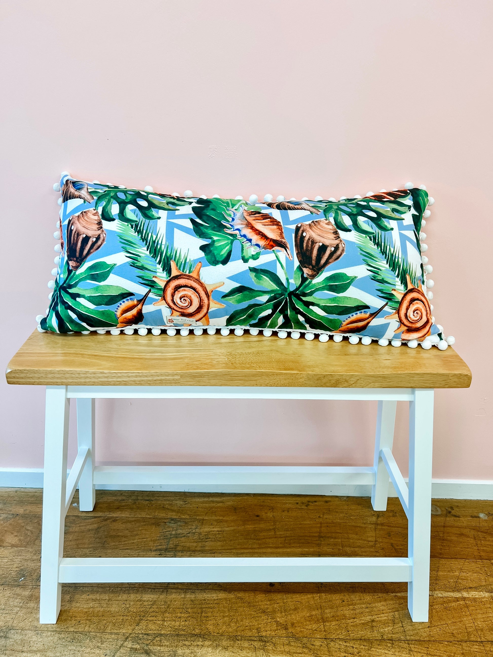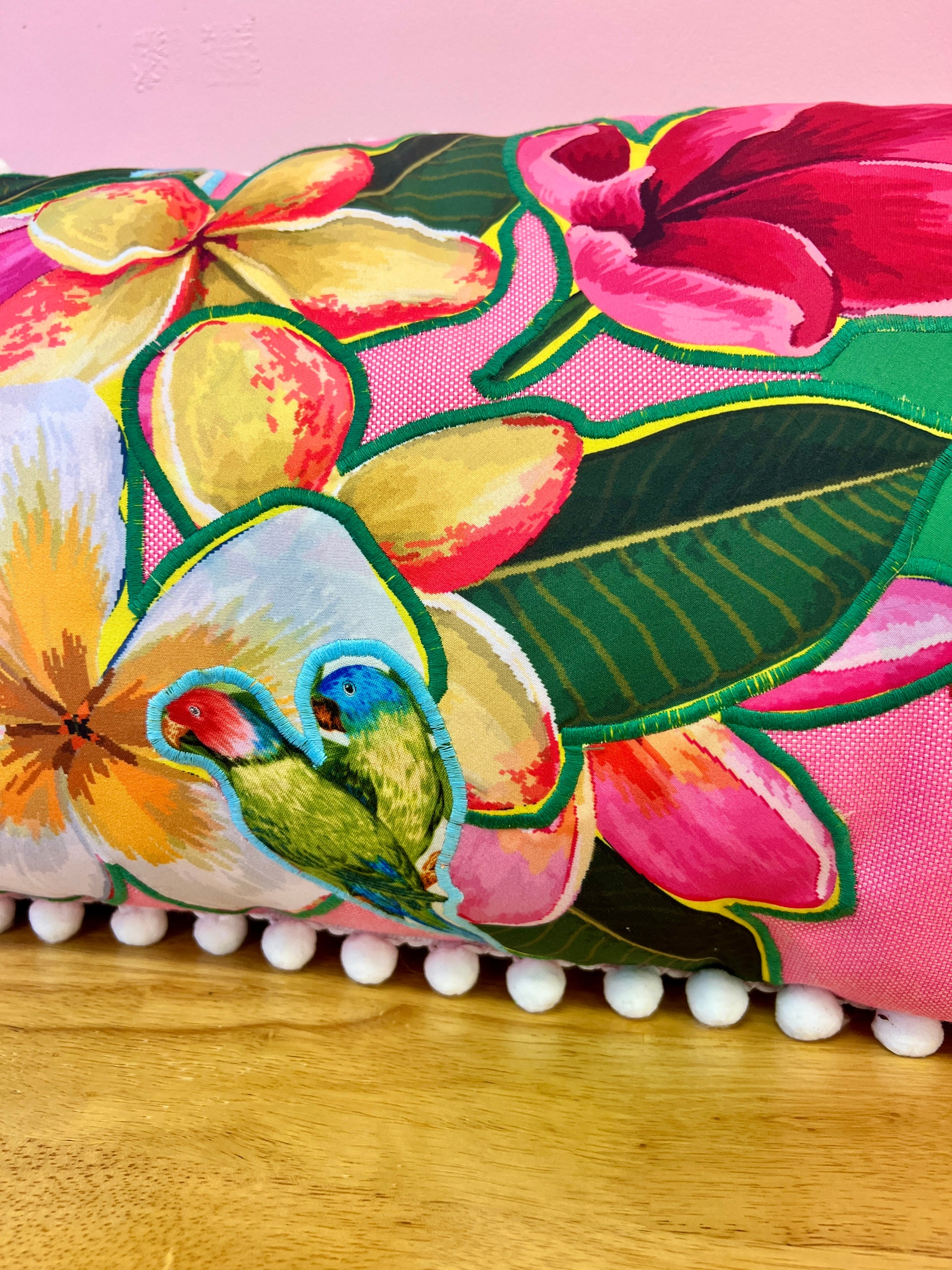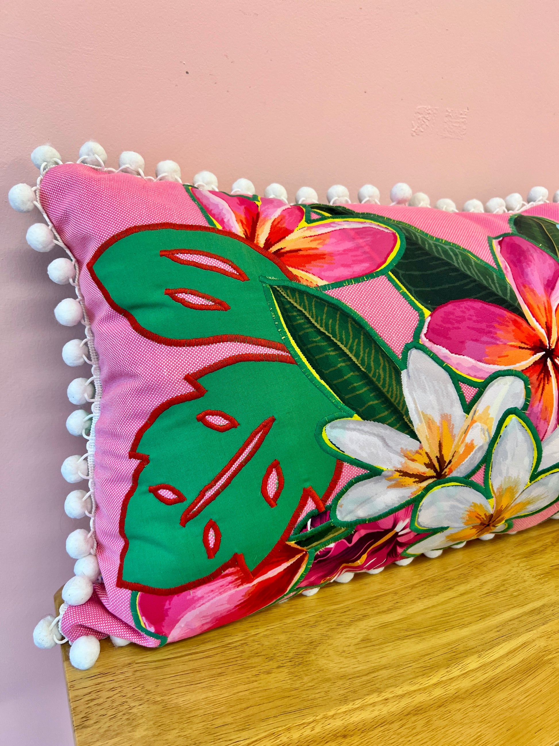 Hot pink cushion featuring large tropical flowers. Very beautiful. White bobbles and pacifika shell backing. A show stopper.