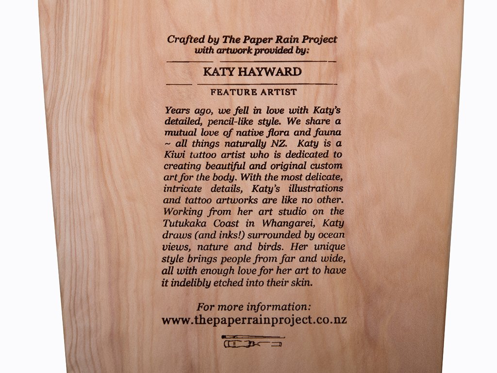 Fantail' designed by Katy Hayward. Laser etched onto a macrocarpa art board crafted in-house at The Paper Rain Project.