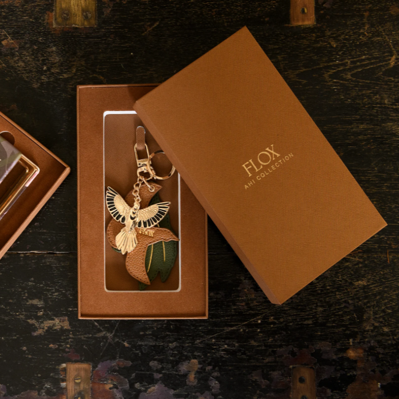 A stylish accent with a meaningful touch, the Ahi Keycharm is designed to elevate your everyday essentials. Whether clipped onto your favourite bag or used as a keyring, this luxe accessory adds a distinctive flair. The standout feature is FLOX’s gold metal Tūī—an iconic symbol of both the artist's work and Aotearoa alike. Beautifully presented in a stunning gift box, the Ahi Key charm is the perfect keepsake for those who appreciate style with a story.