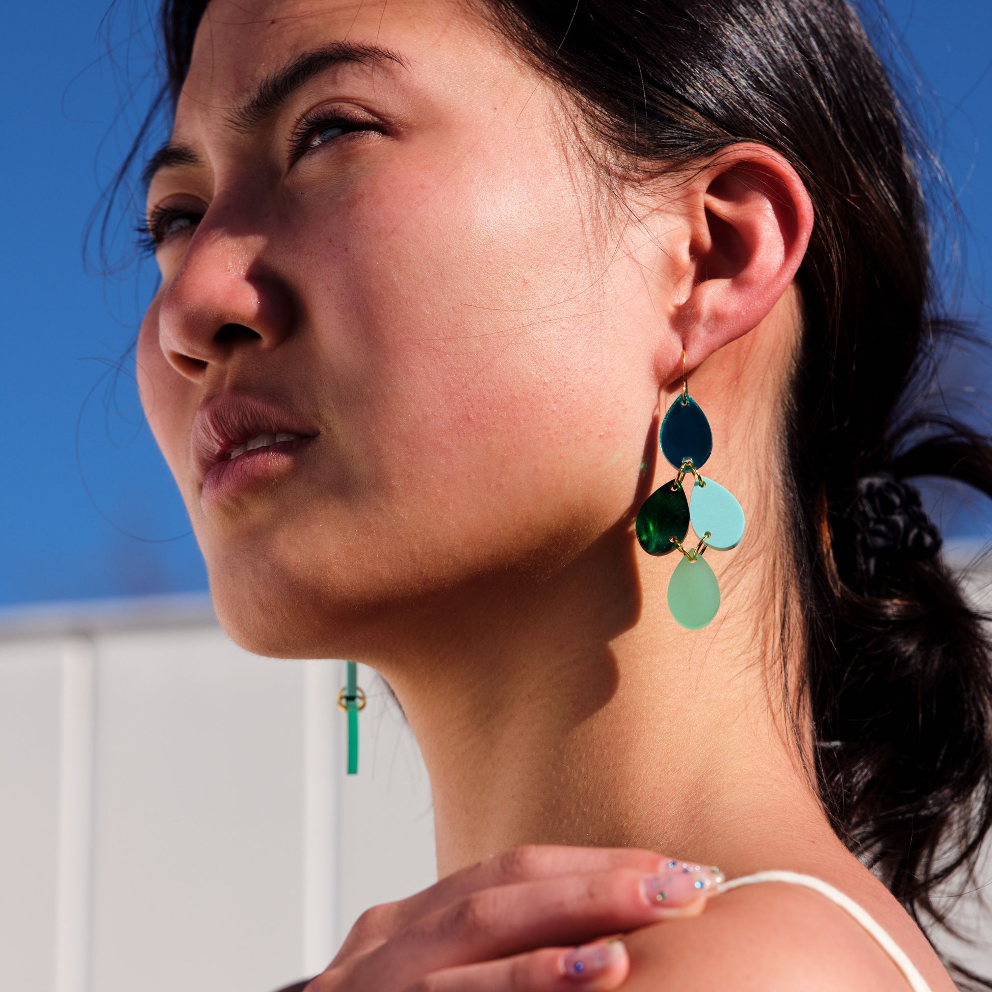 Statement earrings inspired by elegant Parisian chandeliers in a gorgeous shades of green marble, frosted mint and matte mint acrylics and green mirror. Materials: Acrylic, mirror Gold Plated Brass earring hooks. Nickel and lead free Light weight and easy to wear 27mm x 70mm Packaged in a gift box