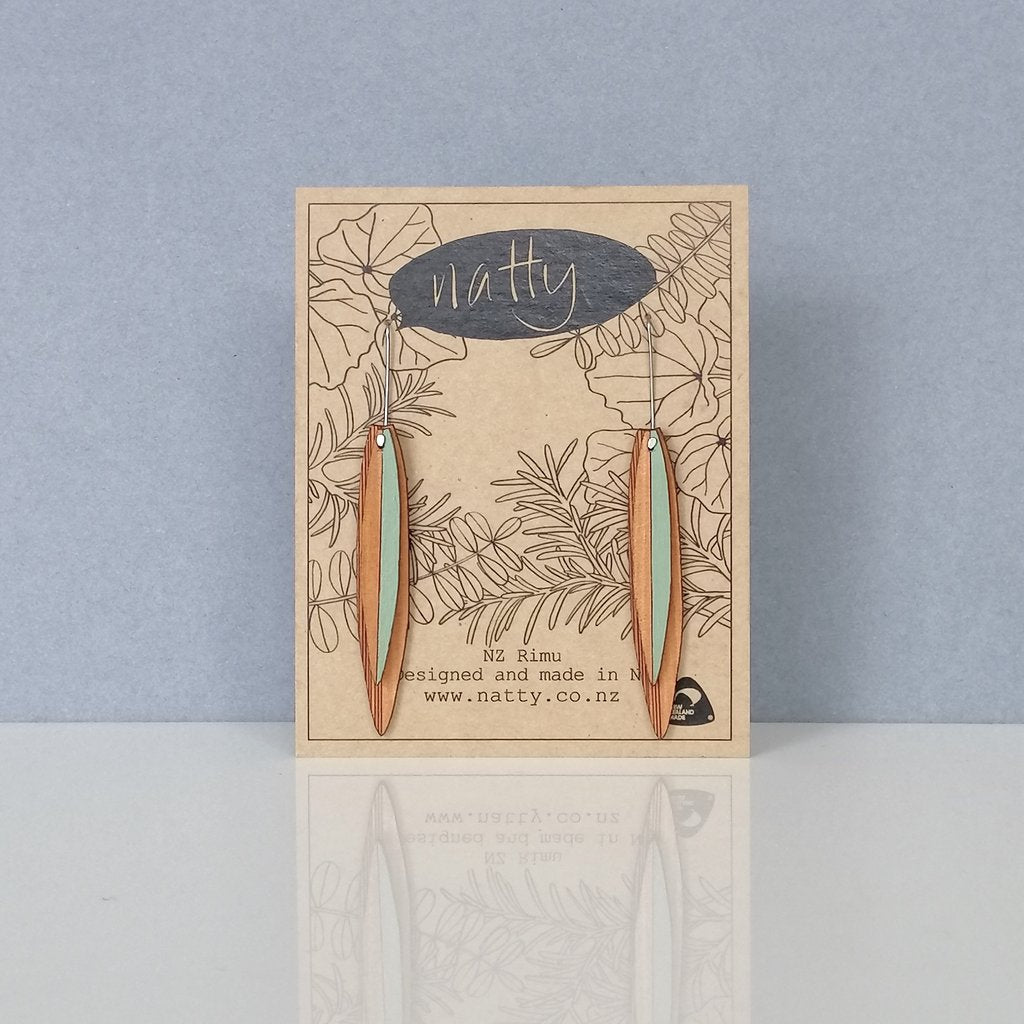 Harakeke earrings in Rimu wood. The earrings are laser cut in our own Flax leaf design, hand painted and are approx. 5.5cm long. The hooks are stainless steel.