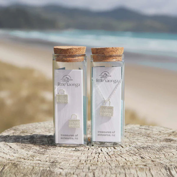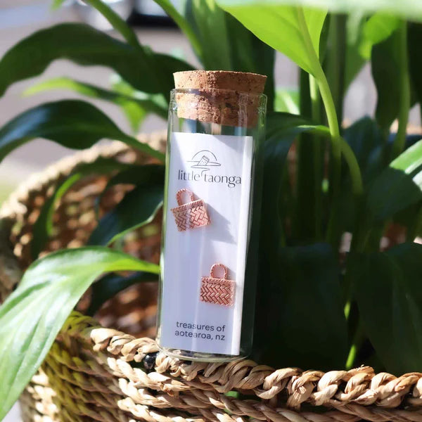 Little Taonga Kete silver plated studs - a traditional Maori basket, traditionally woven by from flax or harakeke. This Kete symbolises Knowledge, strength and life.