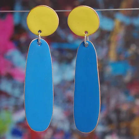 Slightly irregular dots and drops have been hand cut from copper and enamelled. The enamel has then been sanded to create a matt finish leaving a subtle copper frame around the earring. These earrings are lightweight and are stunning to wear. Earring measures 65mm in length and is approx. 15mm in width at the widest point. These are a light weight earring weighing just 3.15 grams each piece.