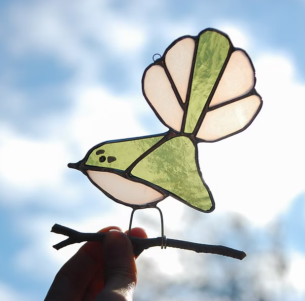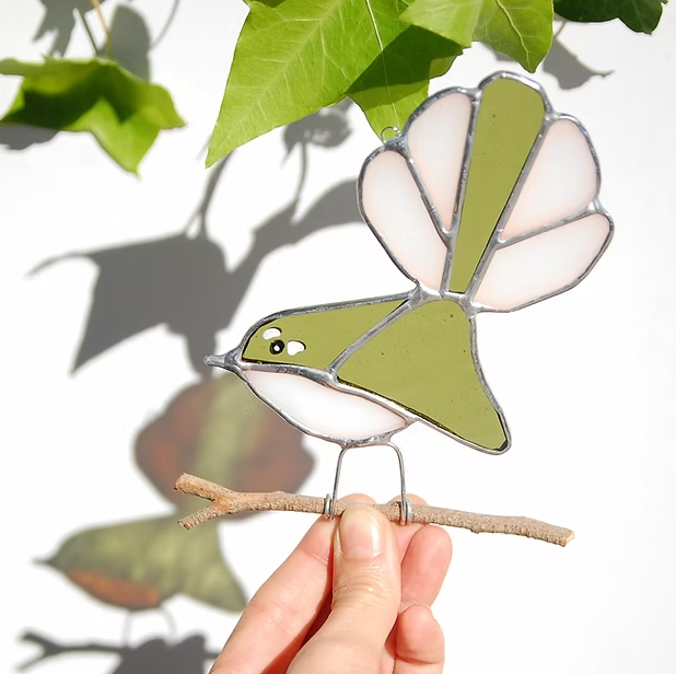 This life size pīwakawaka is made from semi opaque white and transparent olive green glass perched on a little branch.