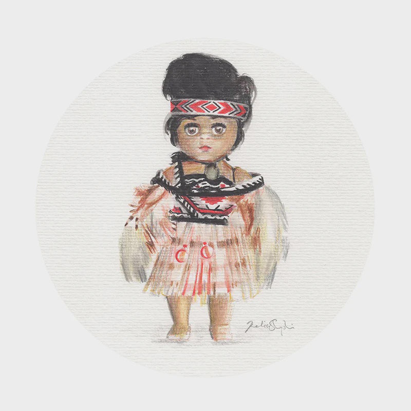 The first drawing in a set of three. This little vintage doll is wearing traditional Maori dress worn by members of Kapa Haka groups for concerts and events, she wears a Kahu huruhuru (feather cloak) Pari (bodice) Tipare (headband) two Poi (balls on string) which are swung to music and song and are hanging from her waistband of her Piupiu (flax skirt) around her neck is a Pounamu pendant.