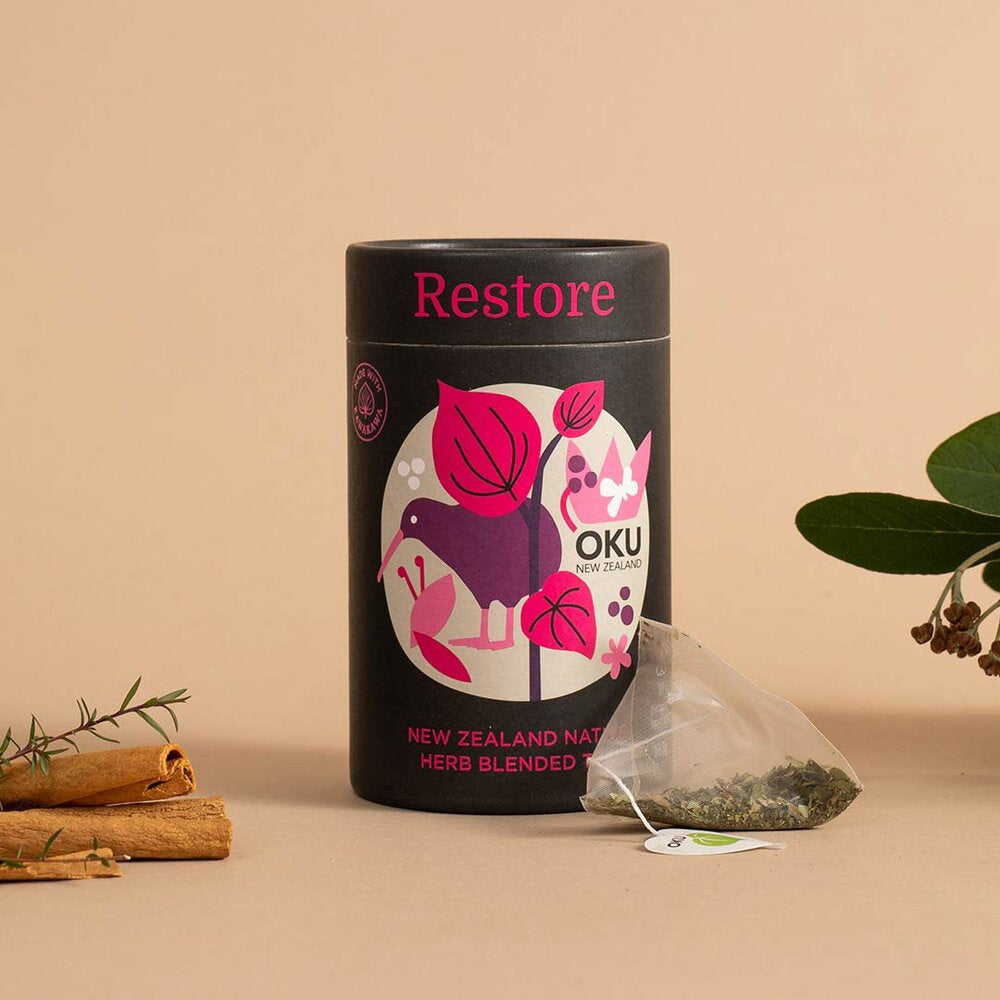 Restore brings together a remarkable blend of NZ Native Herbs that combine Kawakawa, Karamu, Manuka and Kumarahou. These are combined with the spiciness of Cinnamon and Nettle leaf that is well known in herbal folklore. Together these herbs create a truly unique combination that are all about helping and supporting you stay in balance and harmony.