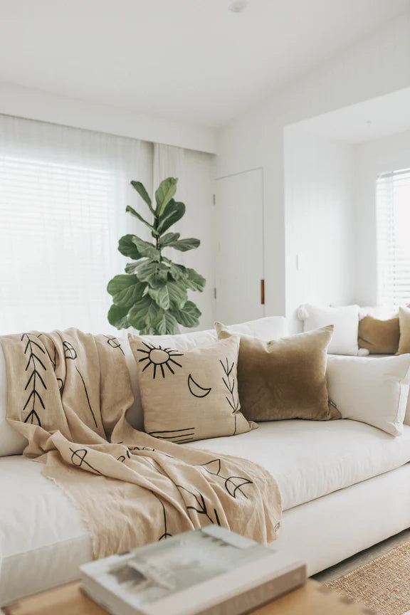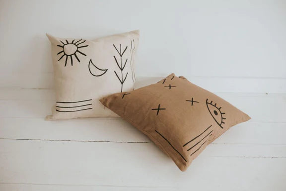 Our beautiful cushion covers are made of 100% linen and are hand-block printed, using natural, non-toxic dyes. Concealed matching colour zip closure.