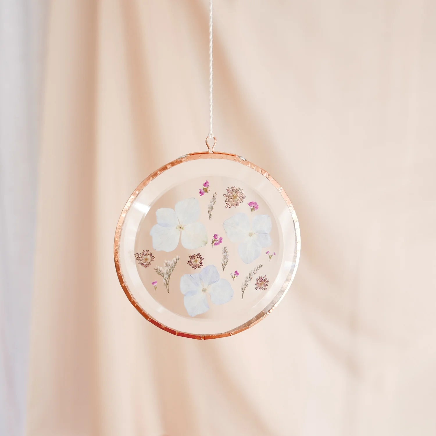 Delicate pressed flowers between glass with copper tape and hook on cotton thread.