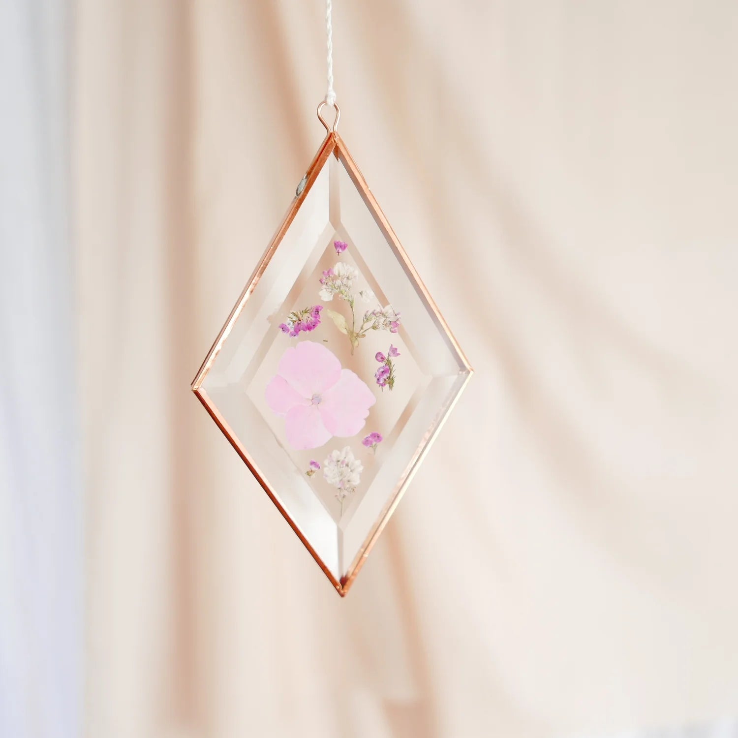 Small Diamond Pressed Flower Suncatcher. Delicate pressed flowers between glass with copper tape and hook on cotton thread.