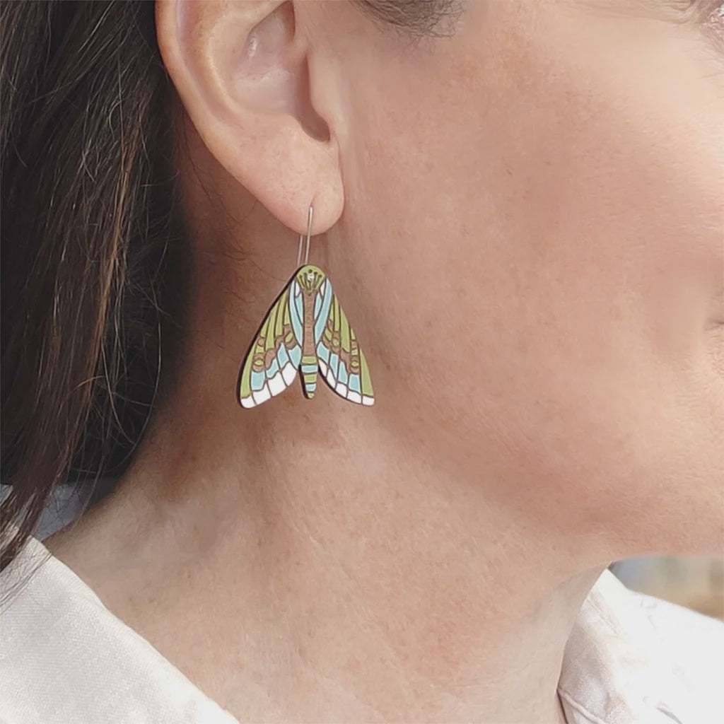 Puriri moth earrings in Rimu wood. The earrings are laser cut in our own Puriri moth design, beautifully hand painted and are approx. 3cm wide and 3cm high. The earring hooks are stainless steel and nickel free.