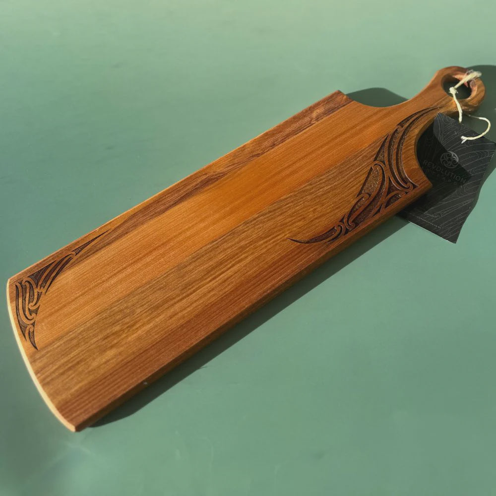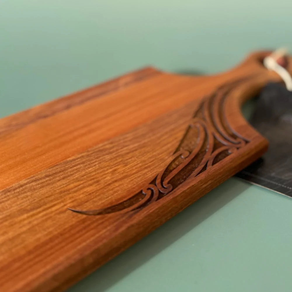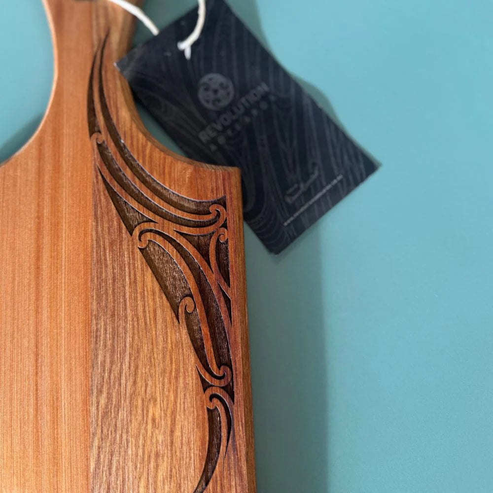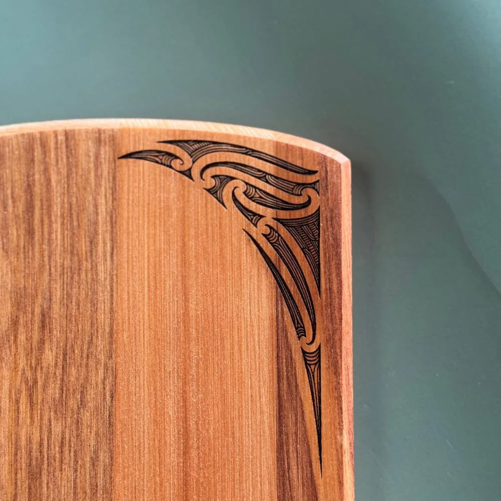 This native NZ timber serving platter features engraved designs that draws inspiration from the rich tapestry of Māori art forms and practices such as Whakairo, Tā Moko, Taniko, and Kowhaiwhai.