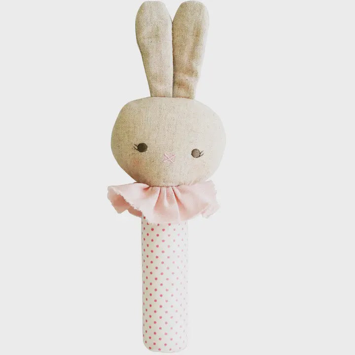 This gorgeous bunny squeaker is a super cute pretty squeaky toy. Suitable from birth. Features: Cotton and poly cotton outer Great for little hands Gorgeous spot fabric handle Cute squeaking noise when shaken or squeezed Suitable from birth.