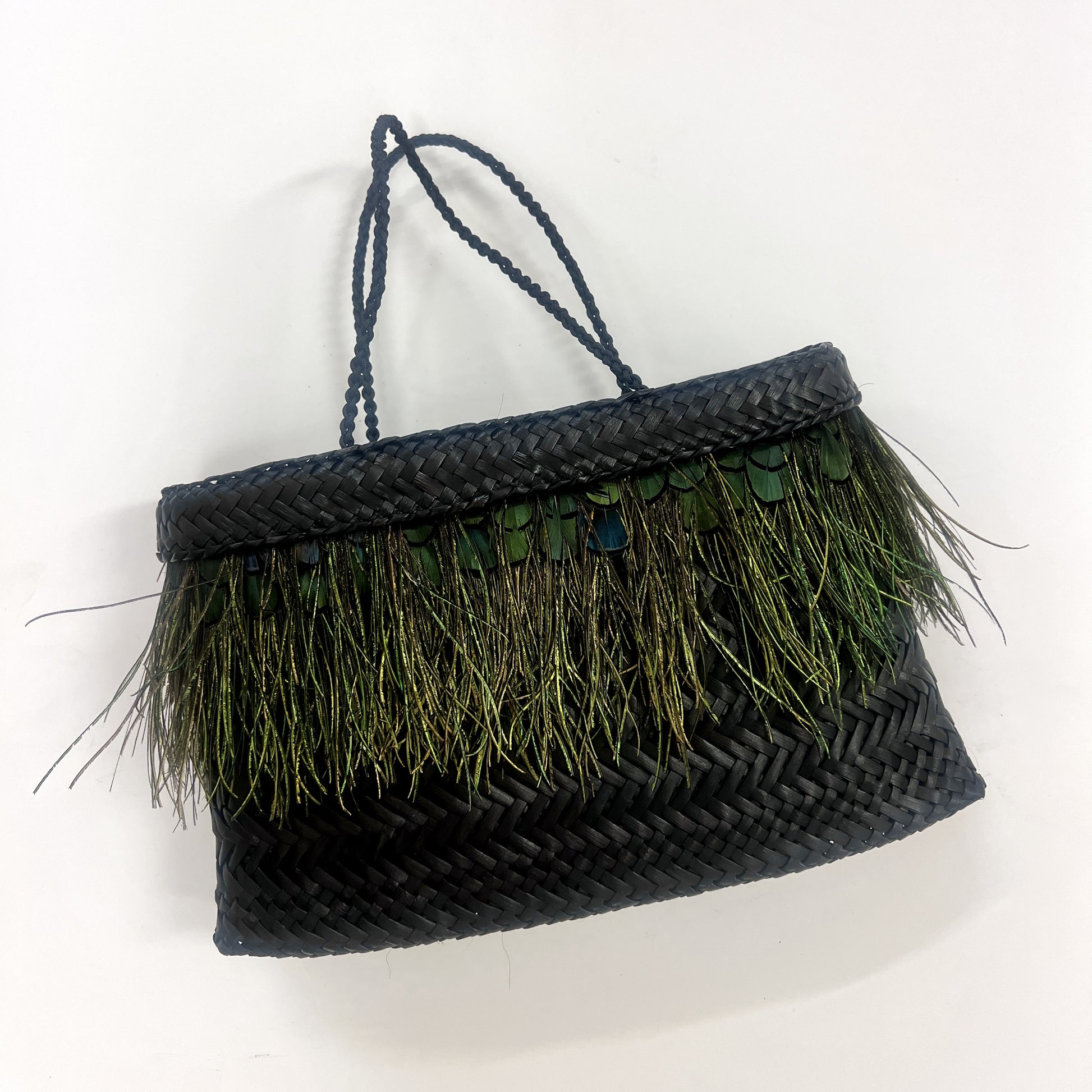Lined with Dupion silk & embellished with pīkake (peacock) feathers