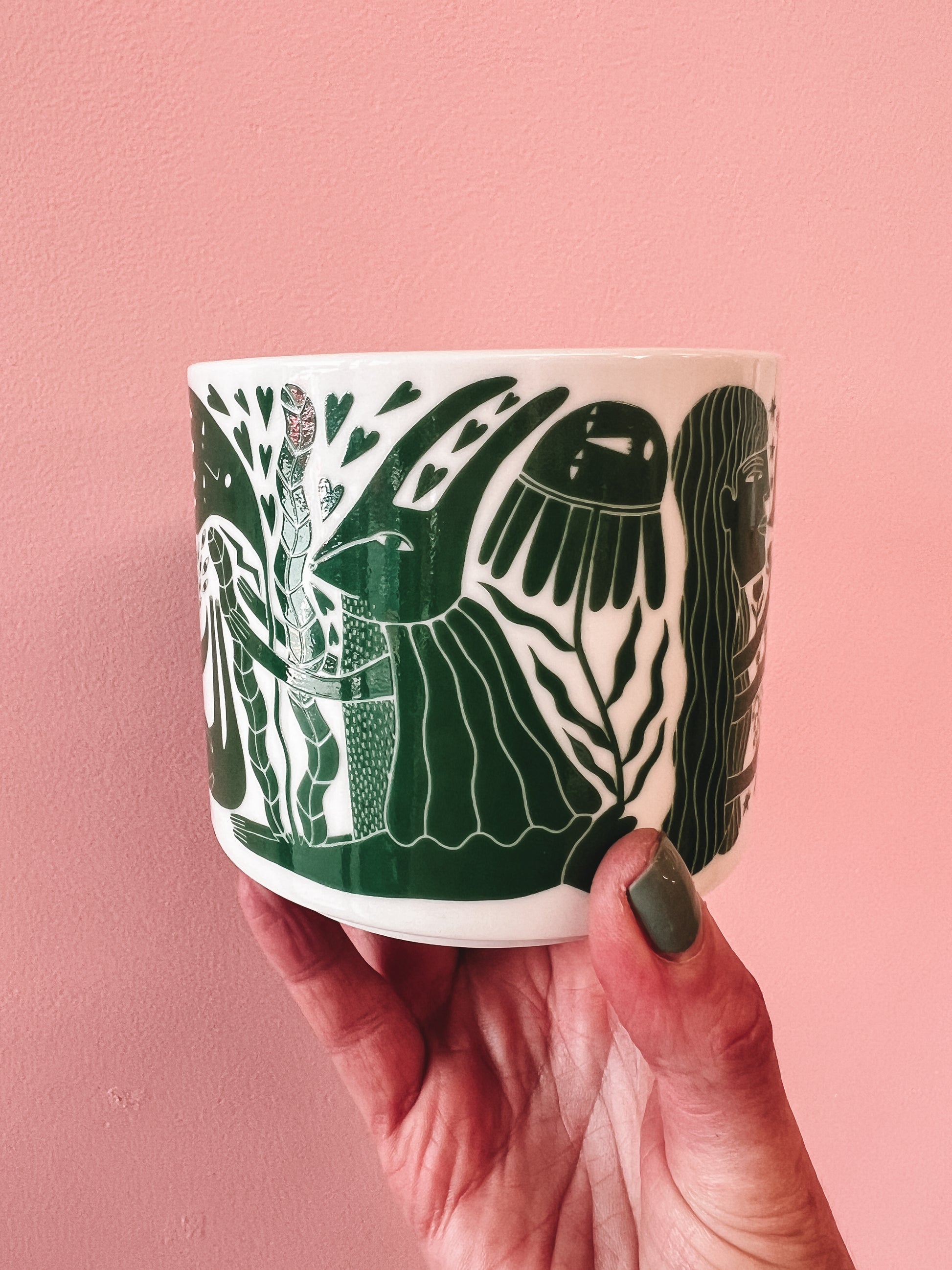 Embrace the magic with our ceramic mug adorned with a forest green decal depicting a dreamy, otherworldly scene. A soft, dream like cloud pink lines the cup.