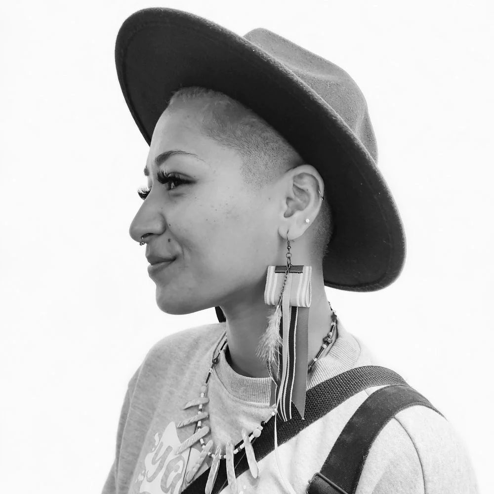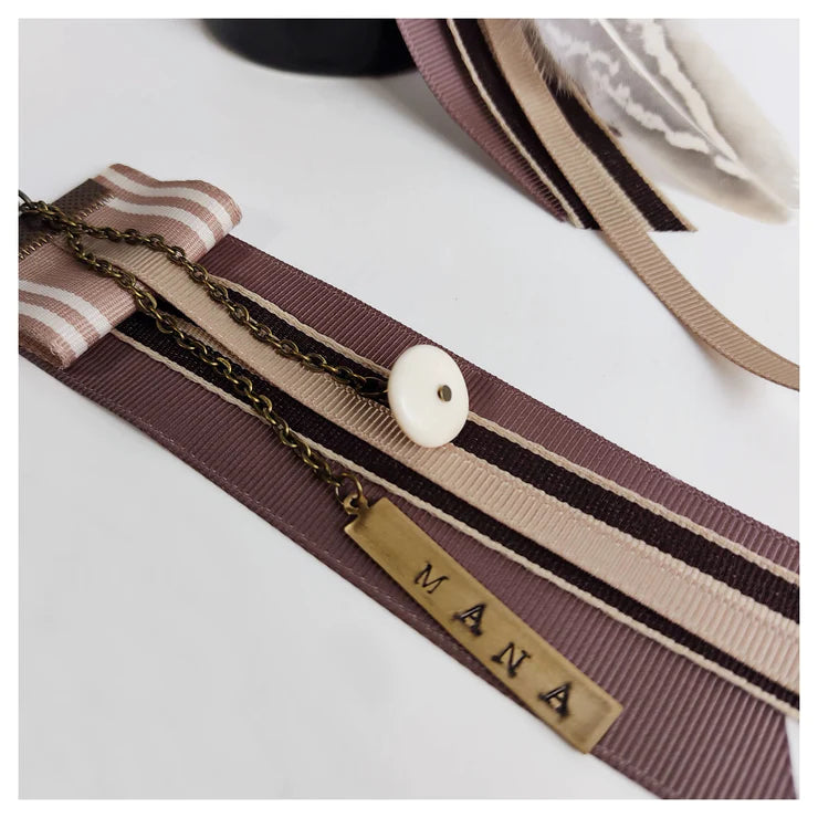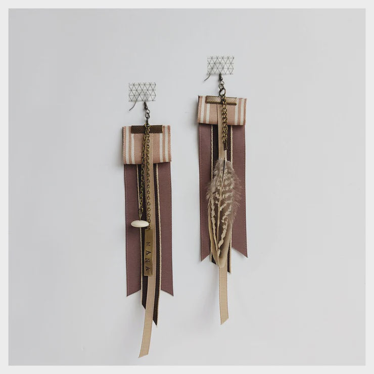 - Ribbon, hand stamped brass, bone, locally gathered feathers, nickel free earring hooks
